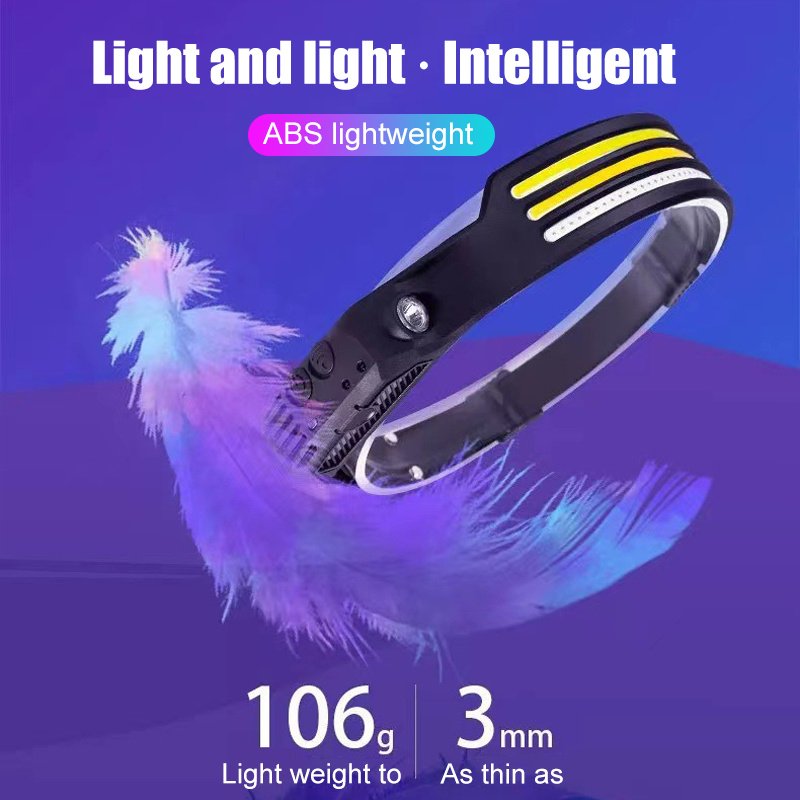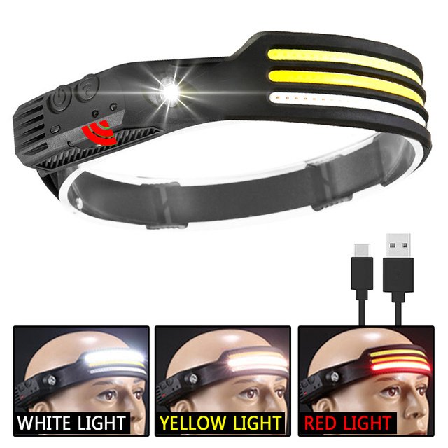 Wide bright beam —  230° wide-angle field of view and 350 lumens suitable for various outdoor scenes.USB charging function — The rechargeable built-in 1200mAh lithium polymer battery .Intelligent sensing technology –– Headlamps are equipped with the latest smart sensors. You can easily control the light on and off by waving your hand. (The induction area is located around the induction switch. When using this function, please turn on the headlamps and the induction switch at the same time)5 Light modes — The led headlamps can meet various lighting needs. It has 5 lighting modes: COB high mode, COB low mode, XPE high mode, XPE low mode, and strobe mode. You can adjust any light mode through the headlight switch. (Note: in any other mode, long-press the power button for 2 seconds to switch the strobe mode, at this time the COB and XPE light flash at the same time)Lightweight & Comfortable –— The headlamp flashlight has an easily adjustable elastic headband and two buckles. Its compact size and IPX4 water resistance are very suitable for running, camping, fishing, and outdoor adventures. (Easily adjusts to hard hats and helmets)